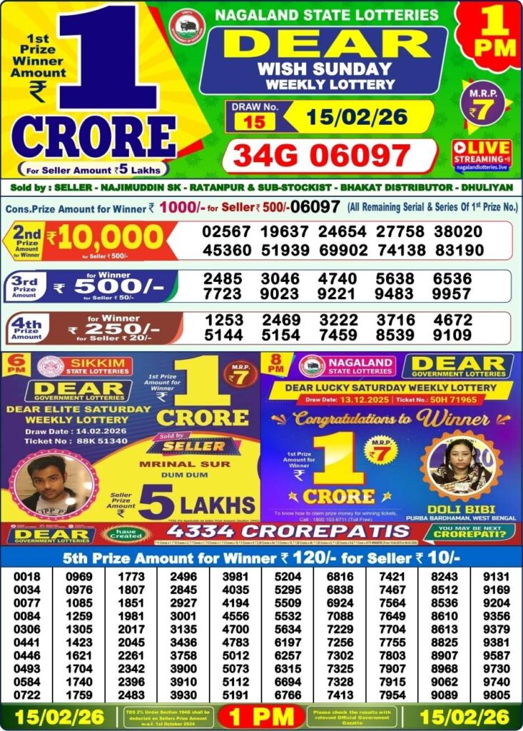 Sikkim State Lottery 15.2.2026moment Result is daily lottery draw whose lottery result is published thrice a day. substantially Nagaland State Lottery is 8 pm, 1 pm, 6 pm Nagaland State Lottery but being combined with lottery sambad, Sikkim State Lottery, Nagaland State Lottery will release the results of 1 pm, 6 pm, 8 pm. is published.